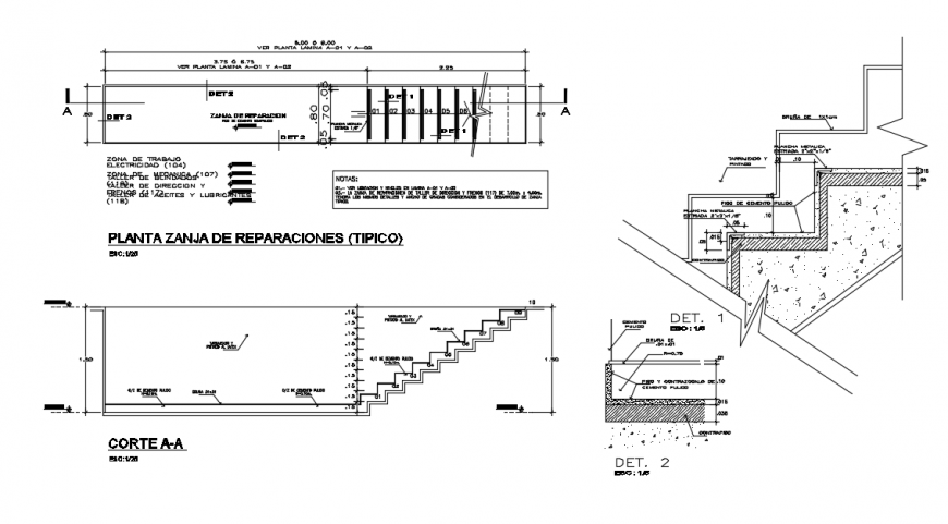 plant repair ditch Detail Section , work area electricity, polished cement floor, bruña of 1x1cm, polished cement floor and counter-skirt detail drawing.