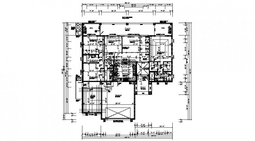 Residential bungalow house autocad drawing plan it shows all room hall, kitchen, bed room, balcony, living room,dining room, porch, shop and garage, toilet unit with semi furniture showing window with all dimensions.