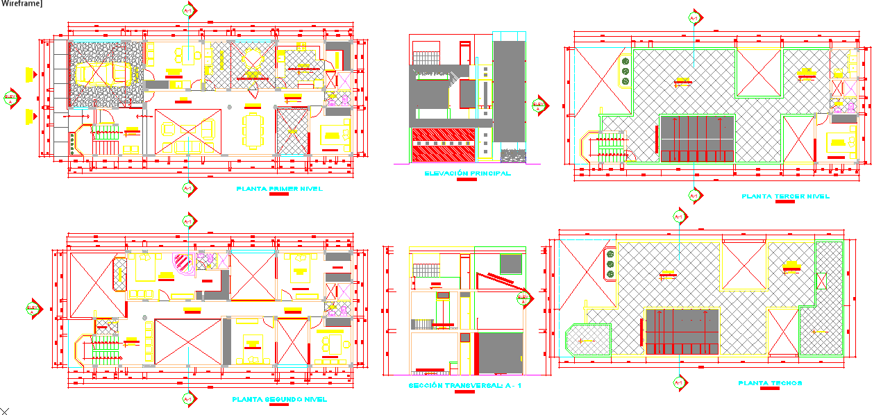Simple House DWG file, Elevations are a non-perspective view of the home. A section cuts through the dwelling and the location of this 'cut through' is noted on the floor plan. Simple House Detail.
