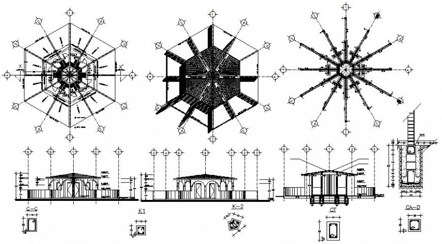 Detailing drawing of gazebo autocad file which includes top elevation of a structure with dimension and hidden line details. Different sides elevation and sectional details are also included in the drawing.