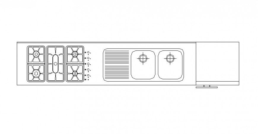 Drawing of kitchen platform which includes sink, gas stove and fridge details.