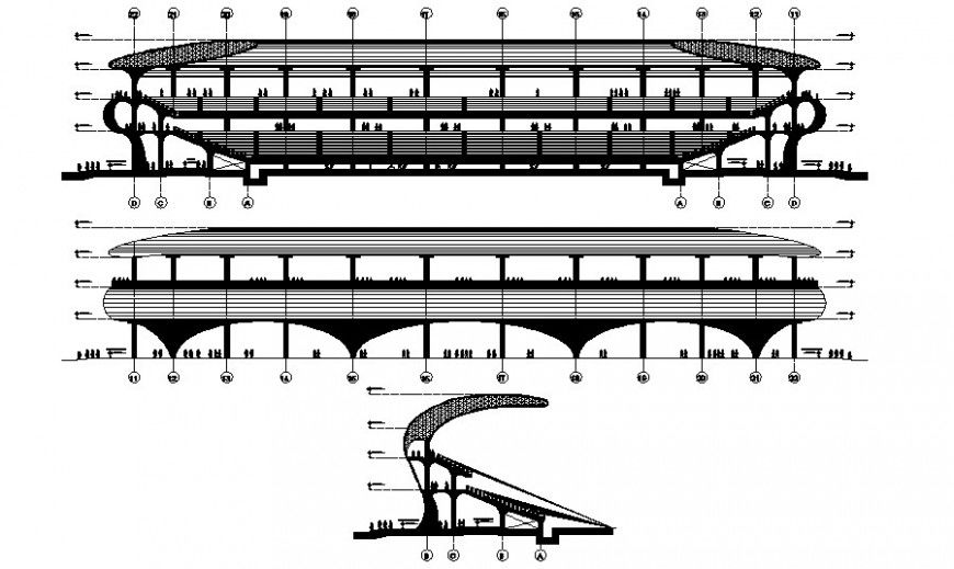 Audience seating arrangement details in autocad which includes front elevation of seating blocks with shade details and dimension details. Side elevation is also shown in the drawing.
