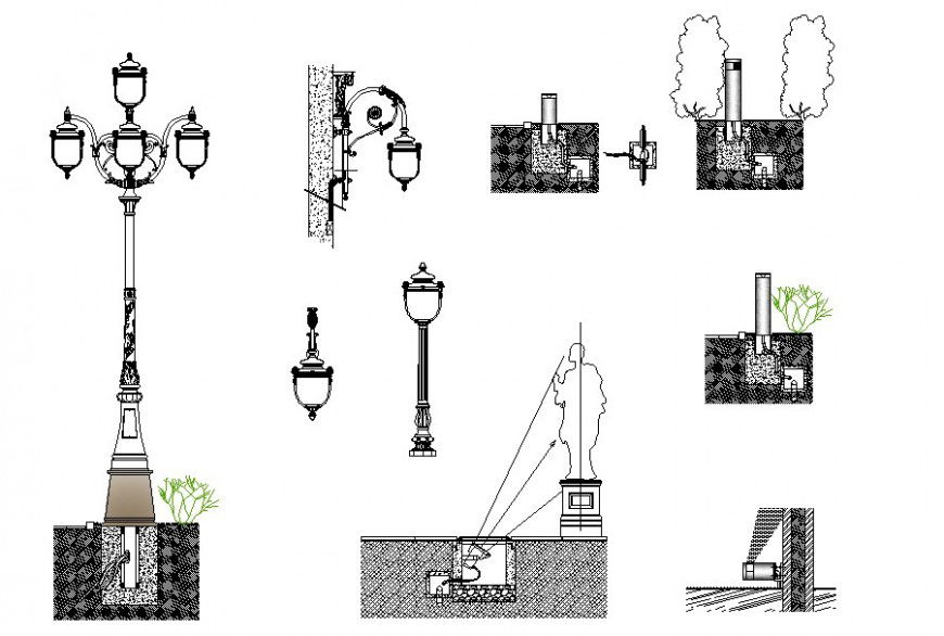 Drawing of lighting fittings AutoCAD file which includes sectional elevation of the lamp post, hanging light, focus light, foot light etc with the detail of wiring how works.