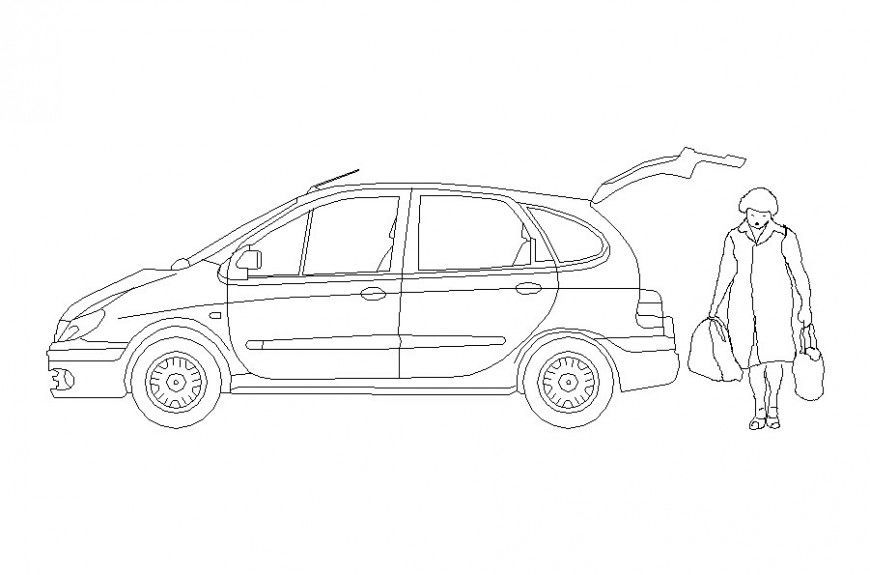 2D car block AutoCAD file which includes a side view of the car with human body elevation.