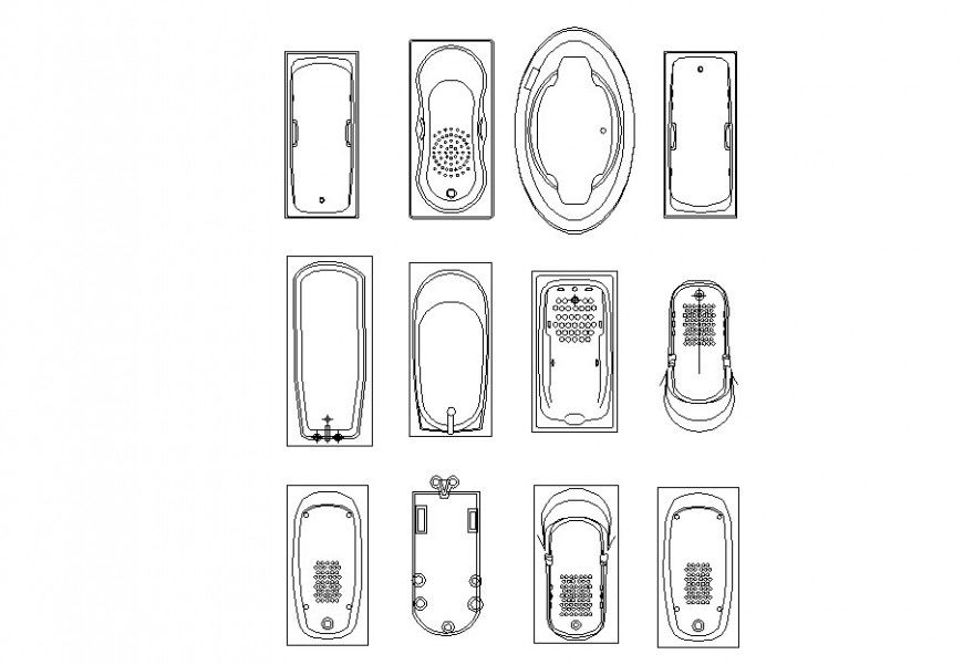 Autocad file of bathtubs blocks which includes top view of bathtubs.