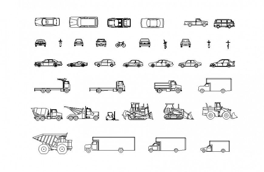 Drawing of different vehicle AutoCAD file which includes a top view and front view of vehicles.
