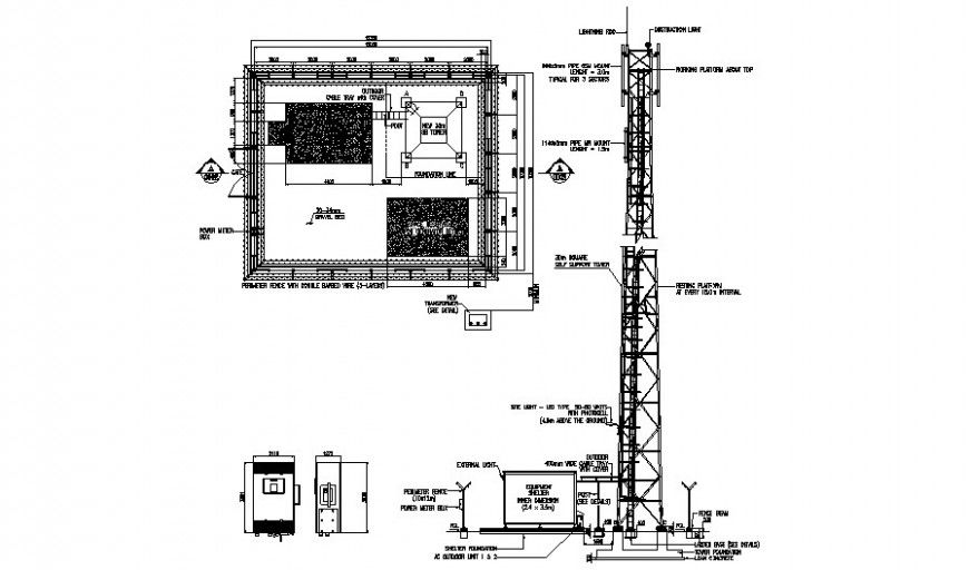 Machinery telecommunication tower drawing details in autocad which includes dimension and section line details with section and crane block details.