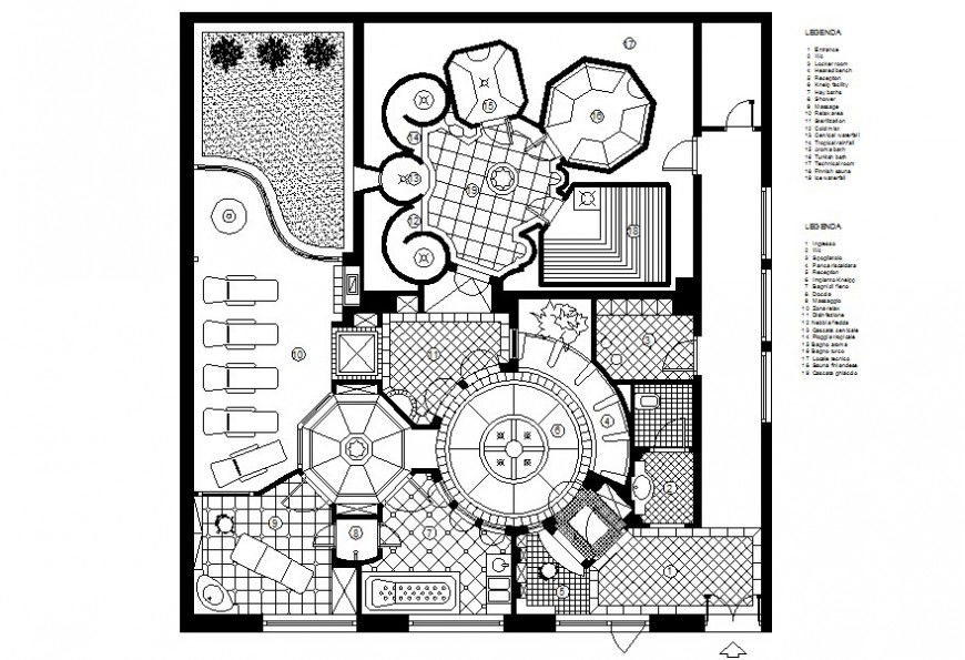 Drawing of wellness center AutoCAD file which includes entrance, WC, locker room, heated bath, reception, hay baths, shower, massage, relax area, cold mist, cervical waterfall, aroma bath, Turkish bath etc.