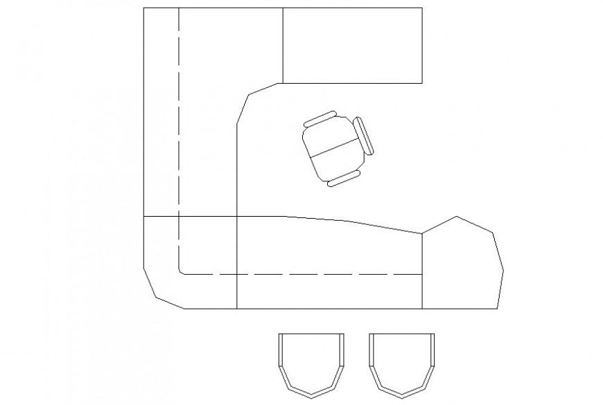 Drawing of u-shape office desk block which includes a plan of table and chairs.