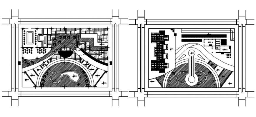 Drawing of urban planning AutoCAD file which includes ground floor detail and first-floor detail, landscaping, seating detail, and other details.