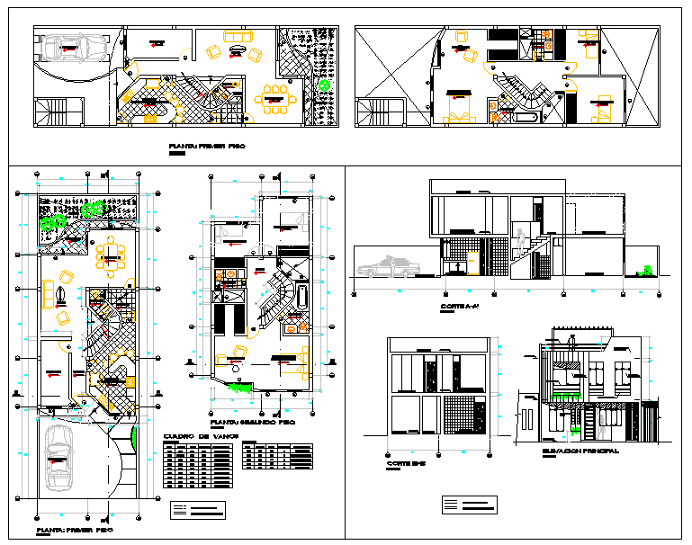 Residential Duplex House Design, First Floor and Second Floor Presentation Drawing with two side elevation in Modern Bungalows Design,. Residential Duplex House Download file.