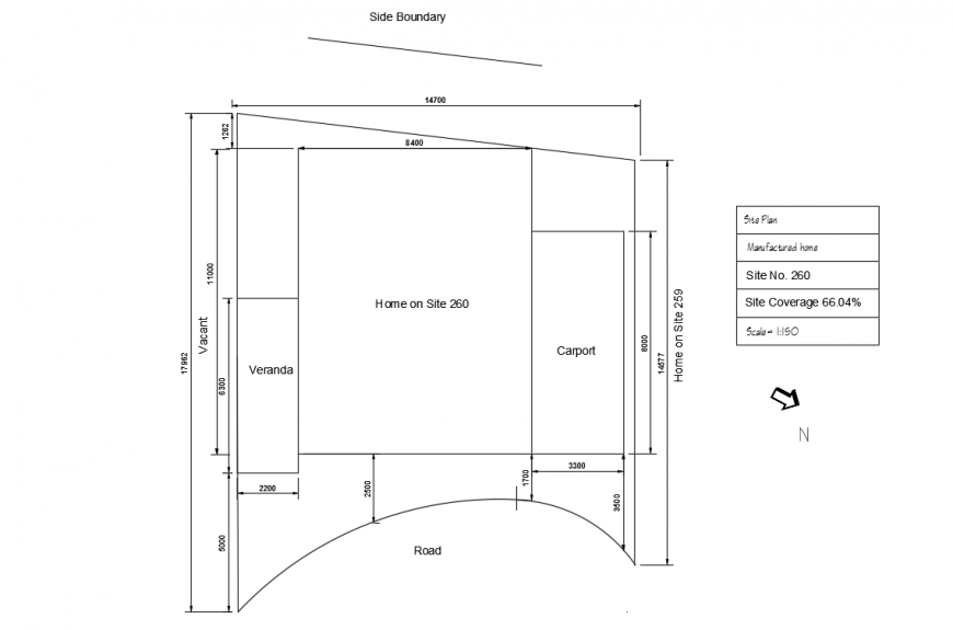House site plot lay-out detail, Site Coverage 66.04%, Site No. 260, Home on Site 259, Vacant, Road, Veranda etc detail.