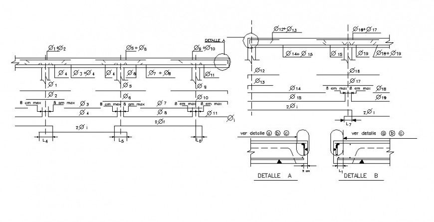Reinforcement details drawing autocad file which includes bar dimension details with hook up and bent up bars details. the structure is a reinforced concrete cement (RCC) structure.