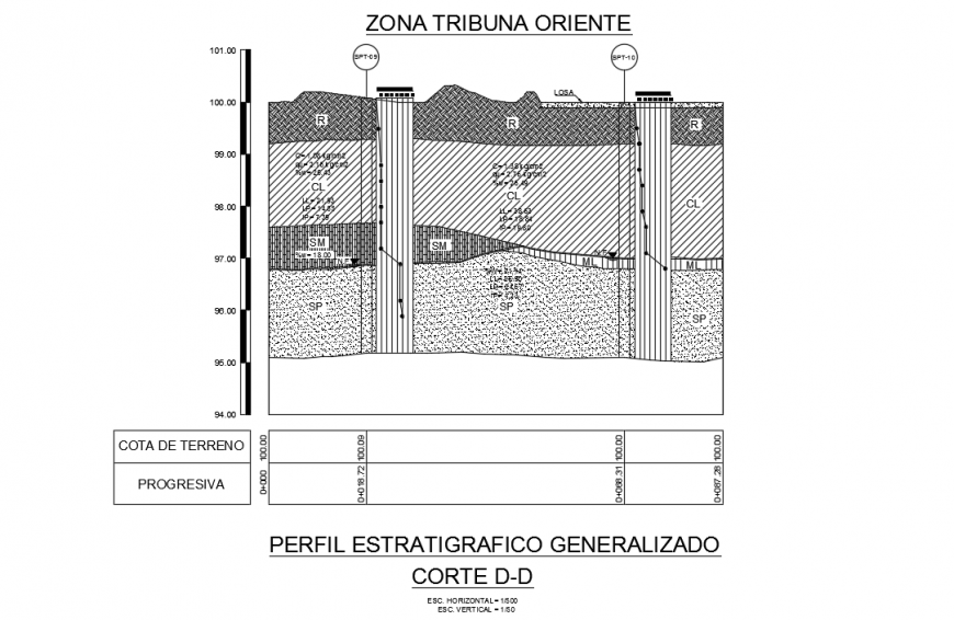 Cutting Section design DWG file Detail, C= 1.38 kg/cm2, qu= 2.76 kg/cm2, %w= 26.49, Number of hits (N), section detail in DWG File.