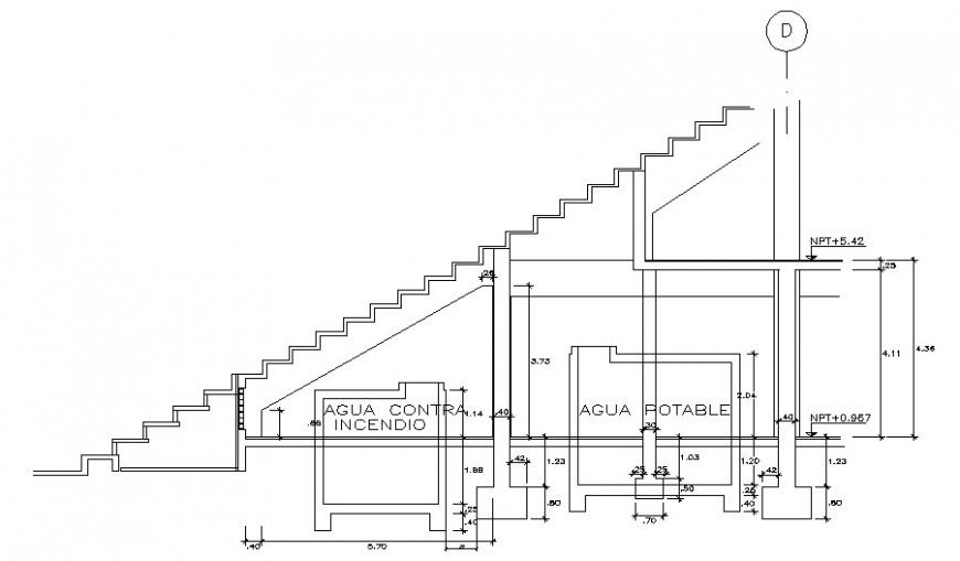 Staircase detail 2d drawing autocad software which includes riser and treads details with dimension and hidden line details. Footing details and leveling details are also included in the drawing.