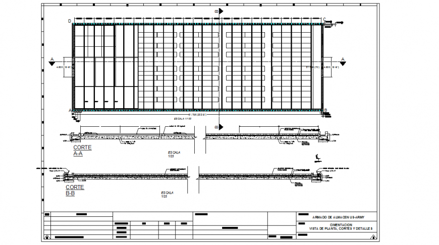 Foundation plant view, cuts and details Download file Design, adocreto rectangular 0.2x0.1x0.08m, Perforated angle for arch anchor, sardinel f'c 175 kg/cm2, etc detail.