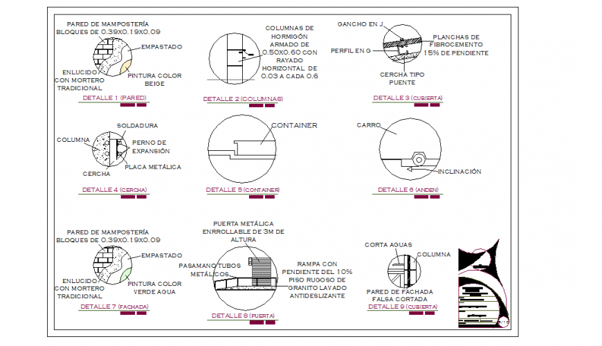 R.C.C Masonry & Elevation Detail Download file, ramp with slope of 10% rugged floor of granite wash non-slip, plaster with traditional mortar, Reinforced concrete columns of 0.50x0.60 with horizontal scratch of 0.03 to each 0.6 design.