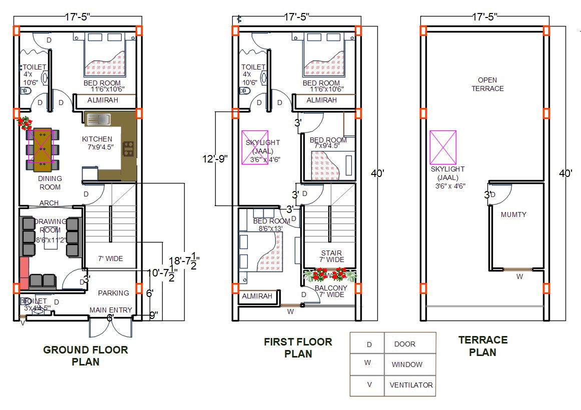 house plan with ground floor plan first-floor plan and terrace plan with working drawing and furniture design drawing room, kitchen, 2 bedroom puja, washroom, parking at ground floor level,