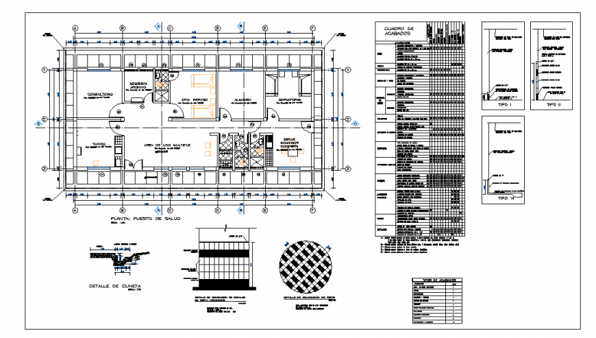 simple clinic plan & structure detail download file, ceramic floor type iv from 0.30x0.30 m., ceramic countertopof 0.2ox0.30 dark color, multiple area, detail of placement of floors.