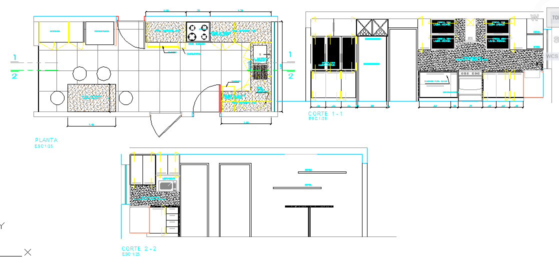 Kitchen Design Download file, . In the West, a modern residential kitchen is typically equipped with a stove, a sink with hot and cold running water, a refrigerator, counters and kitchen cabinets arranged according to a modular design. Kitchen Design DWG file.
