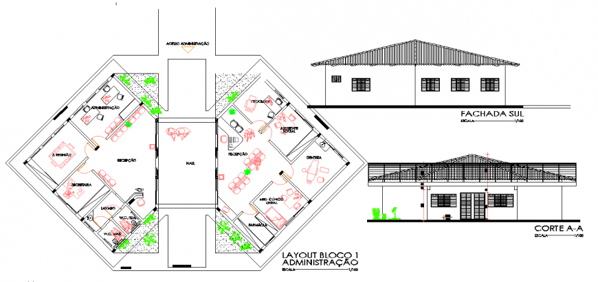 Architectural Official Plan Detail, access administration, pharmacy, proj. coverage, w.c. female, reception & Elevation detail in DWG file