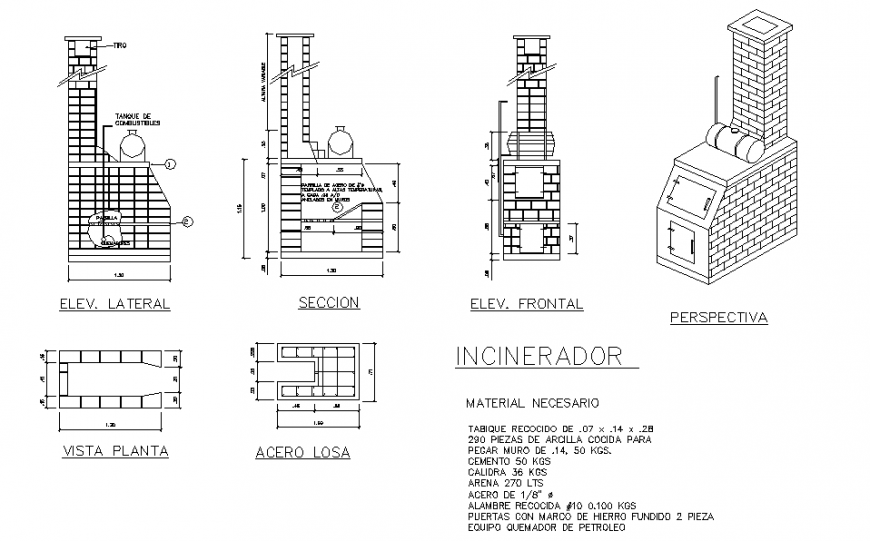 fuel tank Structure Detail & Section detail, 1/4 "steel grill ∅ tempered at high temperatures, at every .03 a / d anchored in walls, annealing wall of .07 x .14 x .28 , 290 pieces of baked clay for paste wall of .14, 50 kgs. cement 50 kgs Calidra 36 kgs sand 270 lts 1/8 "steel ∅ annealed wire # 10 0.100 kgs doors with cast iron frame 2 piece oil burner equipment.