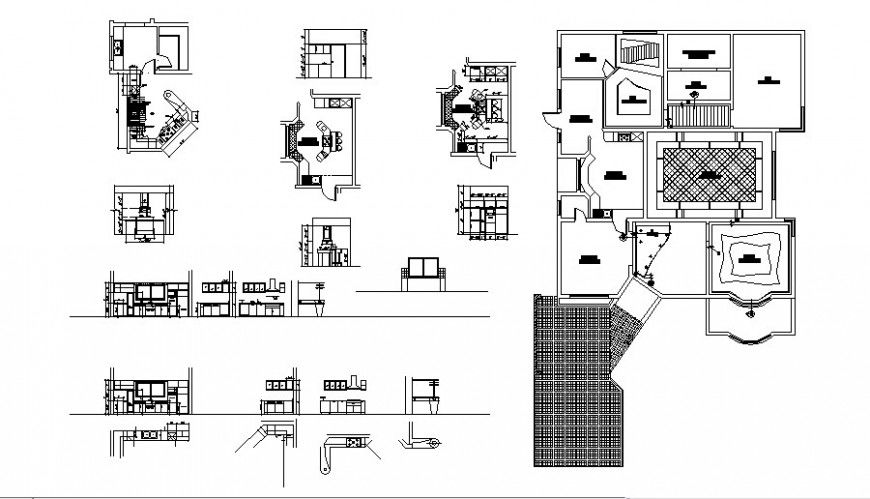 Kitchen detail drawing in AutoCAD file. This file includes the detail drawing of the kitchen with top view plan, service platform, top view plan, wall elevation, platform detail, chimney detail, sink detail, overhead storage detail, elevation, description, dimensions, etc.