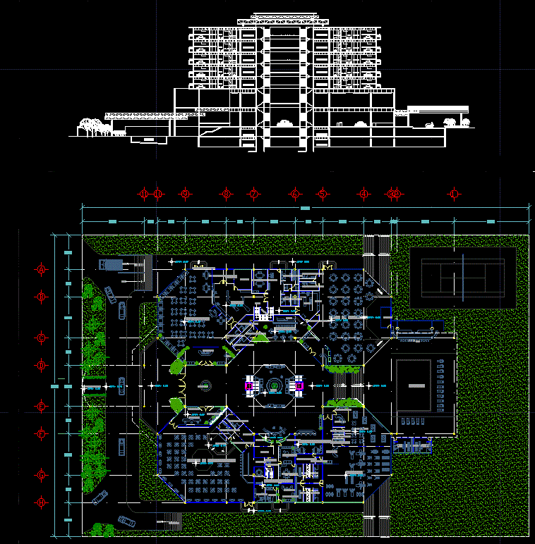 Explore the Hotel Business Class AutoCAD drawing showing floor layout, building structure, and elevation plan suitable for architectural design projects.