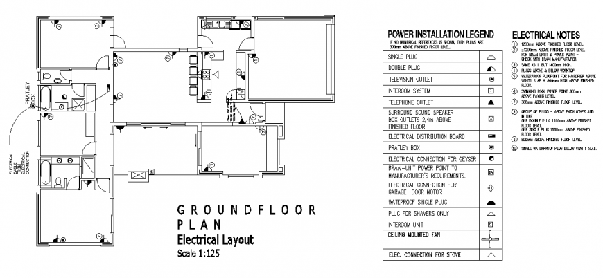 Ground Floor Electric Lay-out design, surround sound speaker box outlets 2,4m above finished floor, braai-unit powerpoint to manufacturer's requirements. waterproof single plug, intercom unit, telephone outlet.