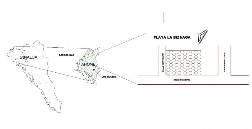 Biznaga beach plan autocad file, north direction detail, hathching detail, line plan detail, grid lien detail, not to scale detail, naming detail, etc.