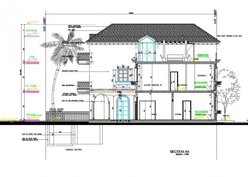 A Section house planning autocad file, dimension detail, naming detail, leveling detail, landscaping detail in tree and plant detail, furniture detail in table and chair detail, roof section detail, slab section detail, not to scale detail, etc.