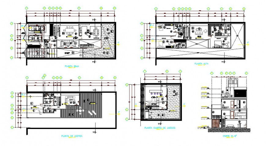 House planning and section autocad file, centre lien plan detail, dimension detail, naming detail, ground floor to terrace floor detail, section X-X’ detail, leveling detail, furniture detail in table, chair, door, window, sofa, bed and cub board detail, section line detail, hatching detail, etc.