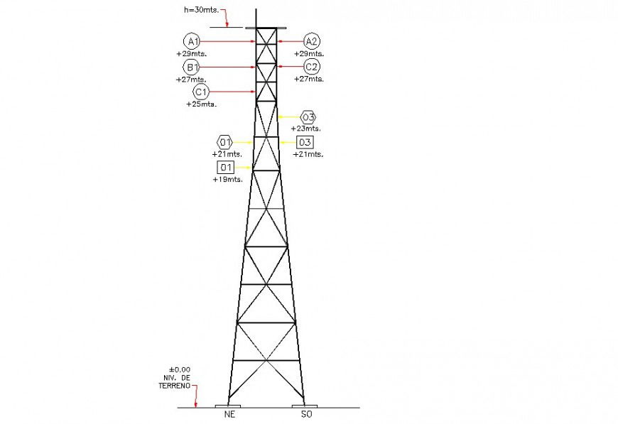 Electrical tower plan layout file, naming detail, height 30mts detail, thickness detail, grid line detail, front view detail, not to scale detail, ground level 0.00 detail, etc.