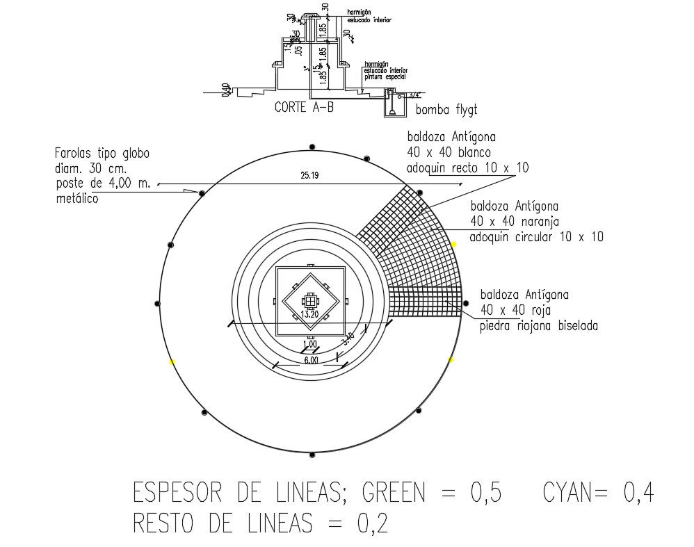 Water fountain download CAD drawing which shows the fountain shape and design details along with fountain plan and elevation drawing.