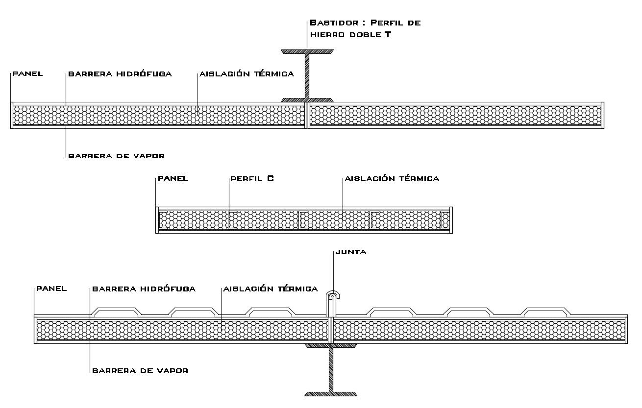 CAD construction details of roofing material which shows the roof span details along with angle sections detailing of C-channel section, I-angle sections, and other structural blocks detailing.