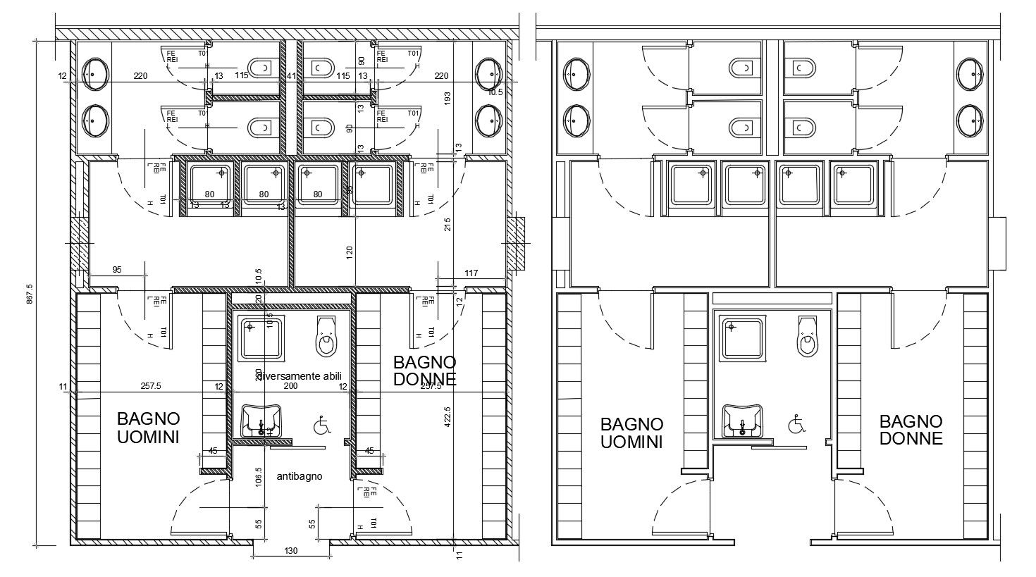 Layout plan design of sanitary toilet plan which shows the sanitary ware details of washbasin, water closet, plumbing blocks details, and other units details in the bathroom.
