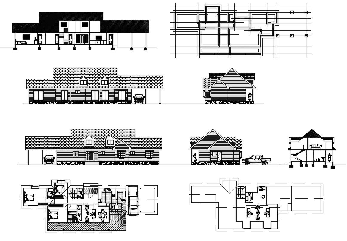 CAD drawing details of residential bungalow plan elevation and section drawing which also includes furniture details, roof plan details, parking space details.