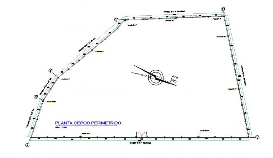 Perimeter fence plan detail dwg file, centre lien plan detail, north direction detail, brick wall detail, furniture detail in door detail, scale 1:100 detail, contour line plan detail, hatching detail, etc.