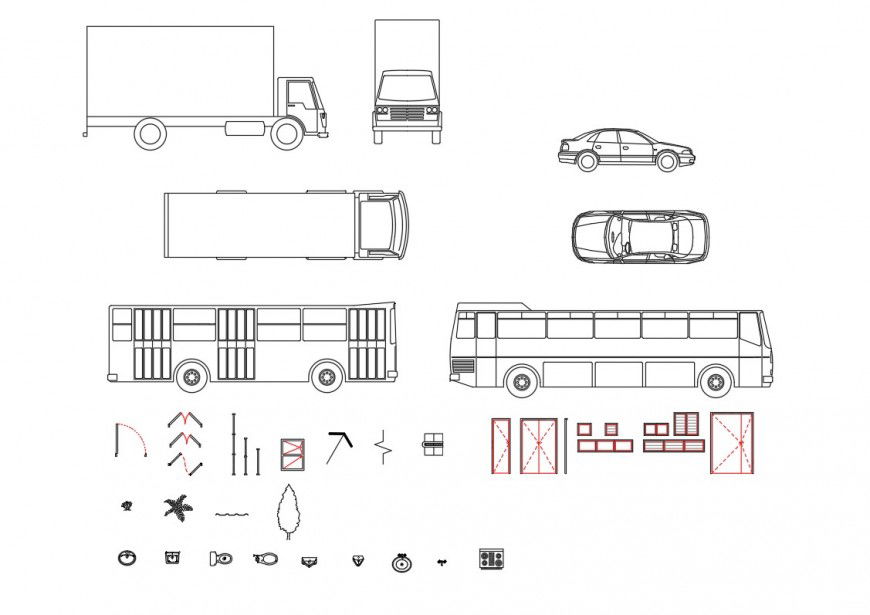 Travelling bus plan detail dwg file, top elevation detail, grid line detail, wheel detail, side elevation detail, car top elevation detail, side elevation detail, door plan and elevation detail, singe and double door detail, sanitary in water closed and sink detail, etc.