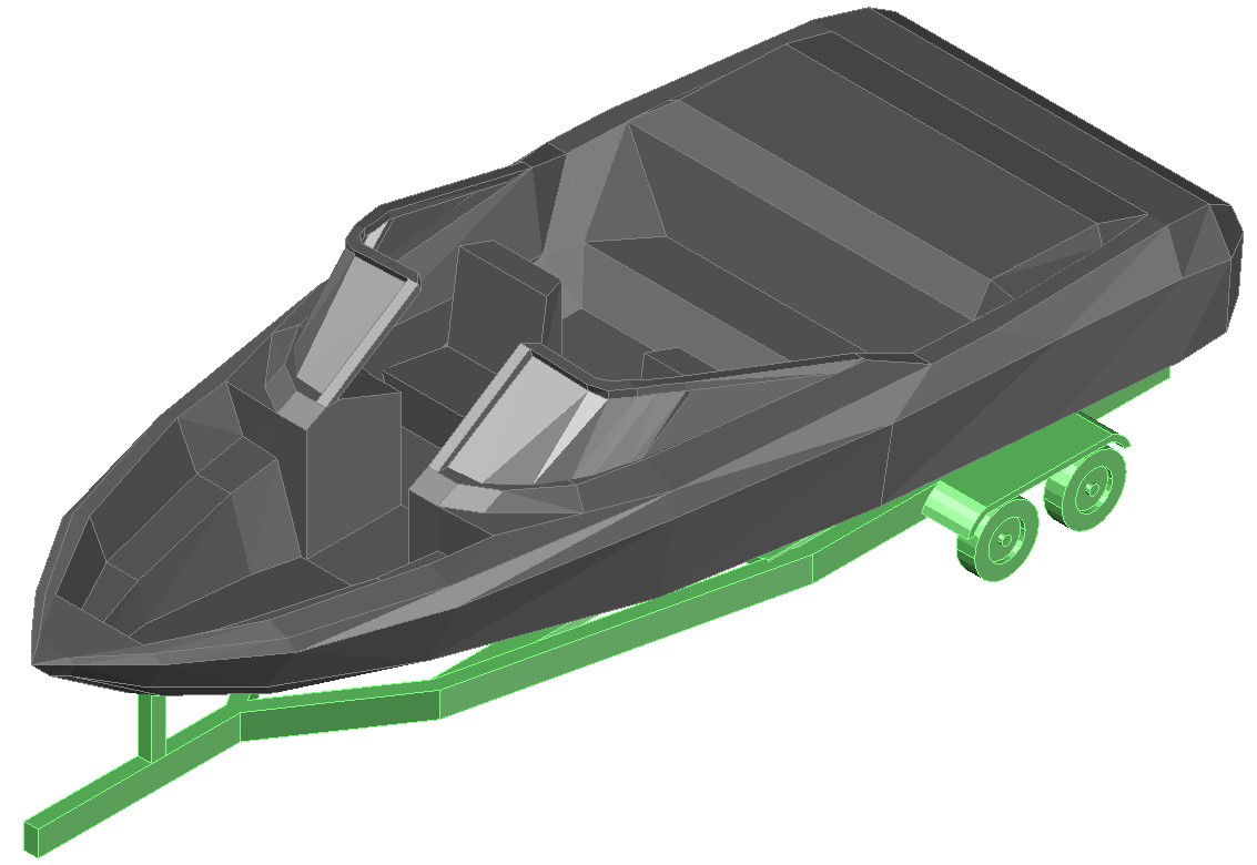 Speed boat transportation wheel trolley which shows an isometric view of the ship along with hatching details.