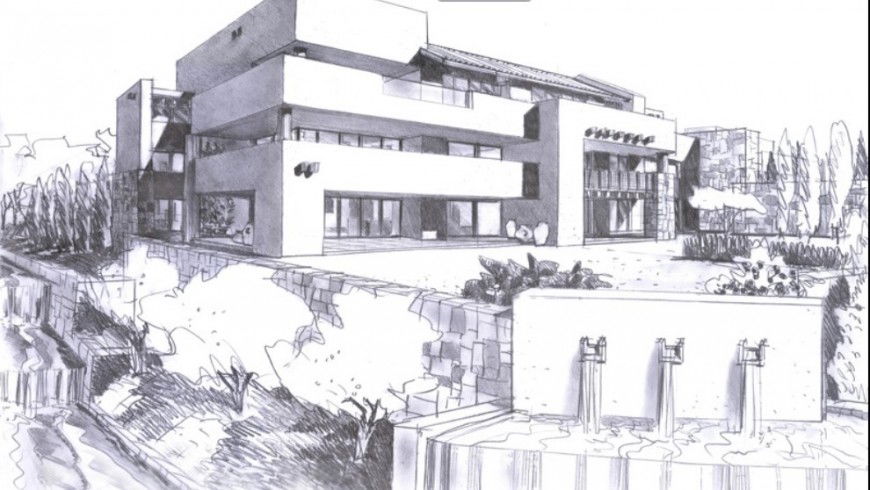Big house 3d sketch detail design, here there is front 2d sketch detail of a house, complete exterior view detail concept