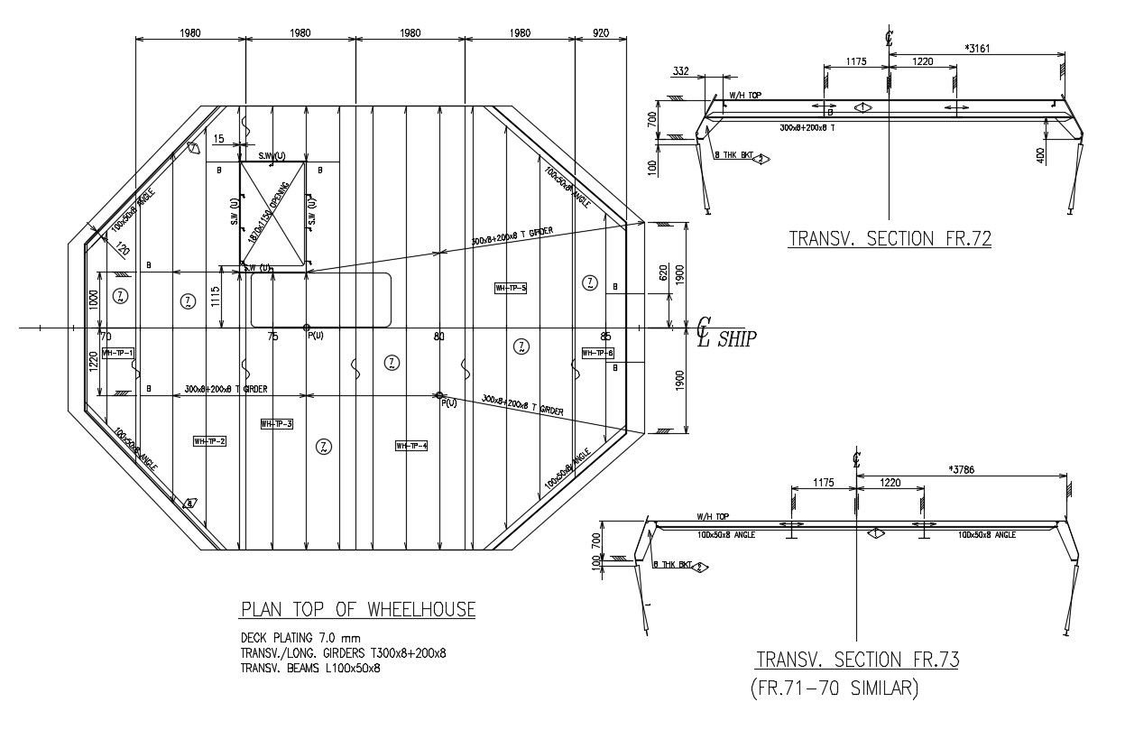 Steel roof deck design which shows the roof plan details along with roof shade material details, dimension details, section line details, and other unit details.