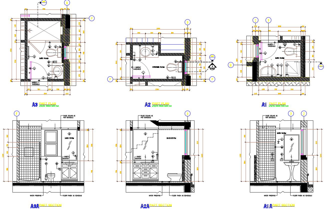House bathroom design plan shows the work plan of the bathroom along with sectional details of the bathroom. Sanitary ware details of washbasin, water closet, plumbing units, the bath-tub area also provided in the bathroom.