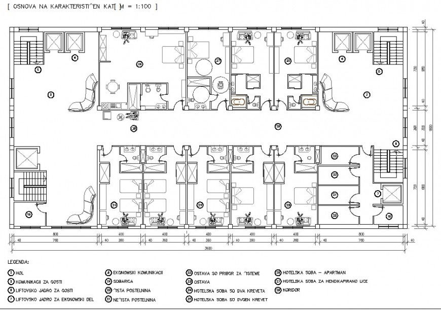 Hostel planning detail autocad file, dimension detail, naming detail, legend detail, top elevation detail, stair detail lift detail, furniture detail in door, window, table, chair and sofa detail, brick wall detail, flooring detail, toilet detail, etc.