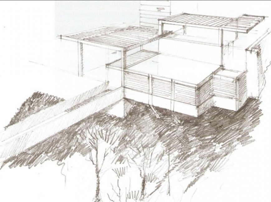 Terrace sketch building elevation view detail, here there is perspective sketch, terrace elevation top view detail, top covering of terrace is shown in image format