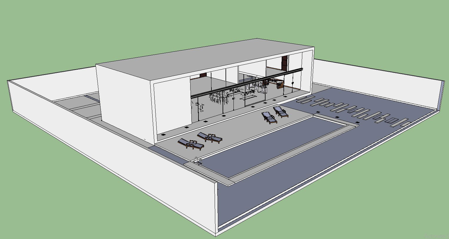 Download beachside clubhouse design which shows compound wall details, relaxing chair details, swimming pool details, isometric view of the building, and various other details.