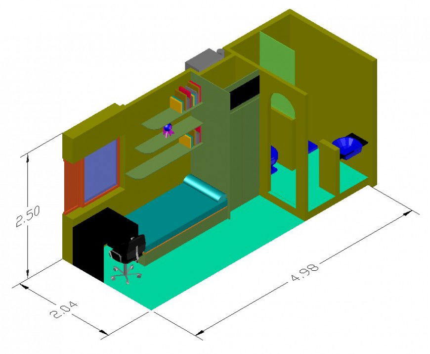 Mini apartment drawing in dwg file. detail 3d drawing of mini apartment, 3d design view, sectional elevation drawing with furniture details and dimensions details.