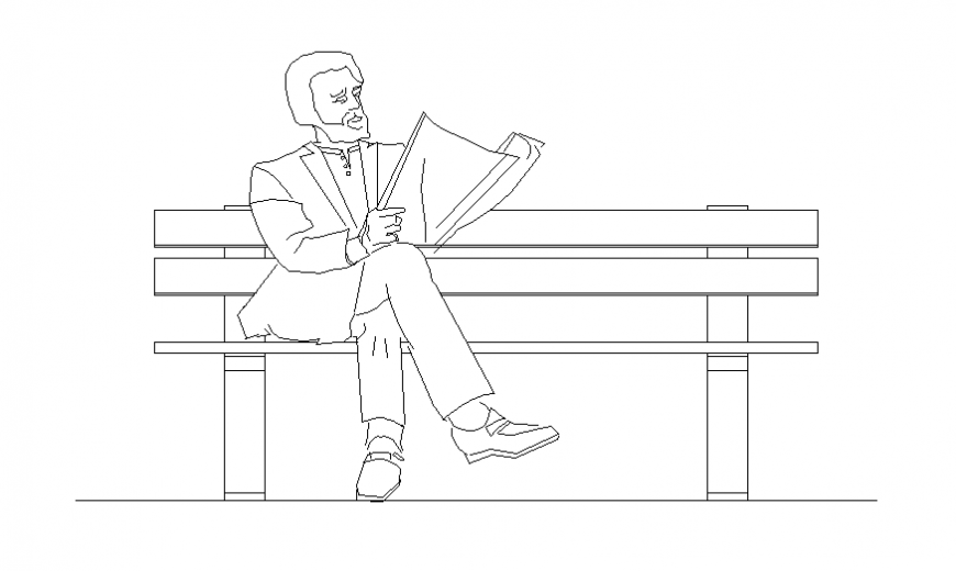 Three seat bench detail dwg file, front elevation detail, wooden material detail, bolt nut detail, line plan detail, men detail, grid line detail, news paper read man detail, etc.