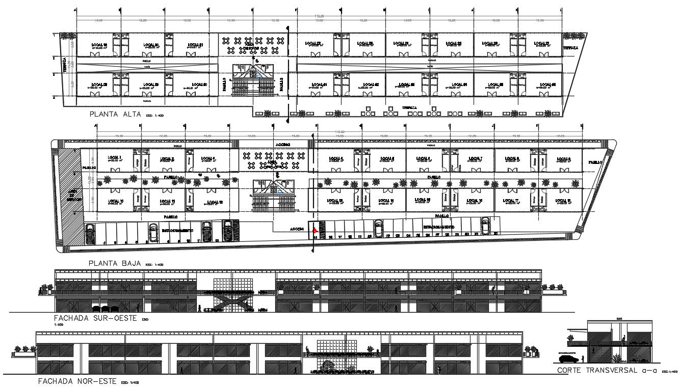 Download commercial building design plan which shows building elevation details and sectional details. Furniture details in building floor level details, dimension hidden line details, and other details also included in the drawing.