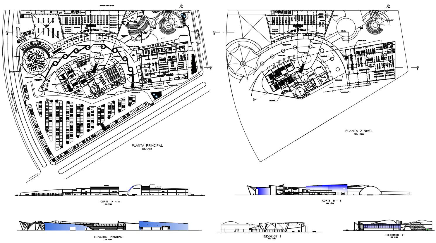 Floor plan design of commercial building hub which shows building elevation and section details, floor level details, parking space details, dimension hidden line details, and other details of the building.